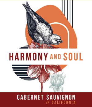 Harmony And Soul Cali Cab wine label featuring bird and floral design.