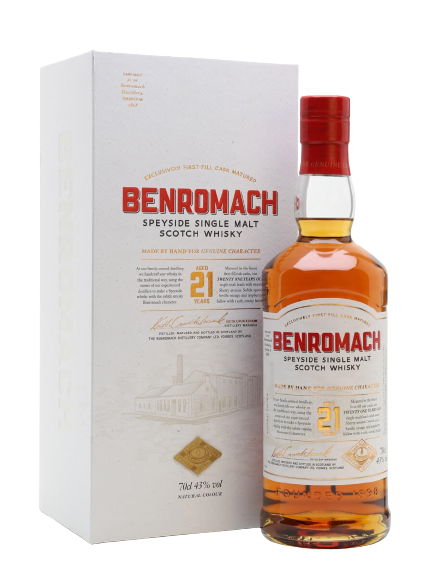 Benromach 21 Year Old Single Malt Scotch Whisky 86° 750 ML is a distinguished Scotch aged two decades for depth and nuance. Benromach 21 Year Old Single Malt Scotch Whisky 86° 750 ML begins with aromas of dried fruit, old leather, campfire smoke, and rich toffee. On the palate, Benromach 21 Year Old Single Malt Scotch Whisky 86° 750 ML delivers silky malt, dark chocolate, and balanced oak spice, finishing long and perfumed. This expression embodies restrained smokiness, refined structure, and aging grace.